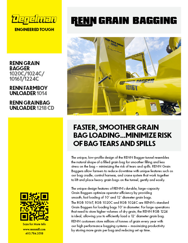 Manufactured in Western Canada and used by farmers worldwide, RENN products are built to withstand the harshest field conditions. Our ongoing commitment to research and development means that farmers can be assured when they choose a RENN Grain Bagger and Grain Bag Unloader that they are getting the best quality equipment, and their valuable commodities are well protected for just pennies a bushel.